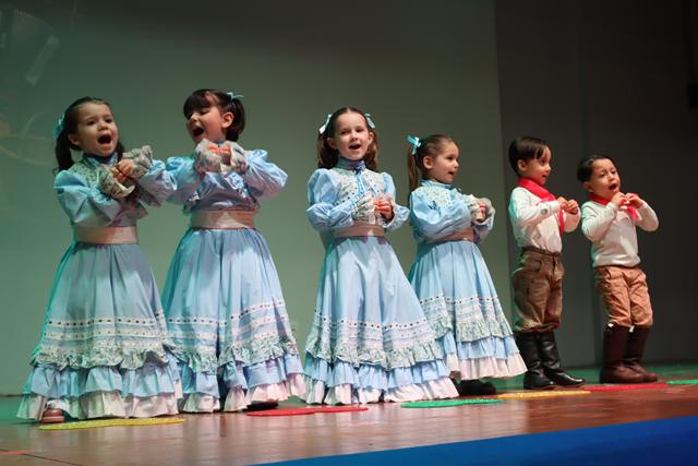 Os educandos da Pré-Escola, por sua vez, homenagearam as culturas gaúcha e brasileira, apresentando-se ao som da vaneira e do samba. Eles ainda demonstraram conhecimentos em Língua Inglesa, os quais são construídos por meio do currículo bilíngue ofertado pelo Colégio, cantando versos amorosos no idioma.