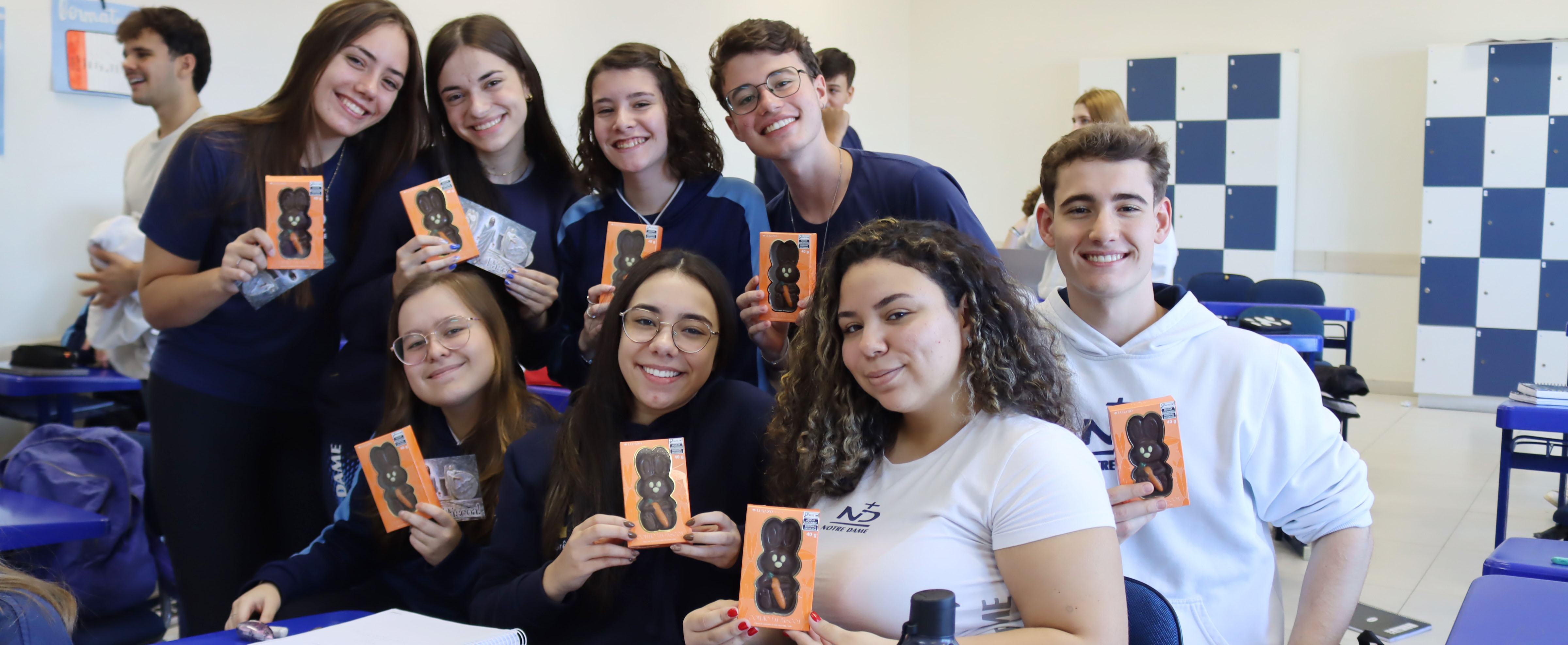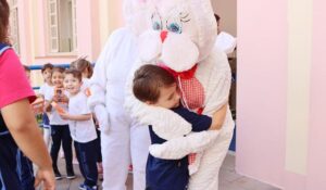Na quinta-feira (17), os estudantes do Ensino Fundamental I ao Ensino Médio receberam coelhinhos de chocolate, entregues pelas Coordenações Pedagógicas e Educacionais. O gesto representou a partilha entre o Colégio Notre Dame e sua comunidade escolar. Já na Educação Infantil, a aguardada visita do coelho da Páscoa foi traduzida em pura alegria: ao som da tradicional canção “Coelhinho da Páscoa, que trazes pra mim?”, os educandos aguardavam o Sr. e a Sra. Coelho, que distribuíram os doces às crianças.