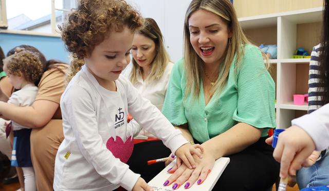 Os educandos que compõem as turmas de Maternal I e II, por exemplo, prestaram homenagens à medida que convidavam suas figuras maternas à cumplicidade de uma produção artística em conjunto, na qual delineavam as próprias mãos sobre tela, eternizando os laços que unem mães e filhos. As crianças matriculadas no Maternal III, por sua vez, fizeram do toque expressão de amor e cuidado, oferecendo uma massagem relaxante às suas homenageadas. Já na Pré-Escola I, as convidadas partilharam com os educandos momentos de descontração, ao ritmo das coreografias reproduzidas, e de quietude, enquanto meditavam e conectavam-se consigo mesmos. E na Pré-Escola II, os filhos dedicaram-se a embelezar suas figuras maternas, adornando-as com lenços e presilhas, além de maquiá-las com delicadeza e zelo.